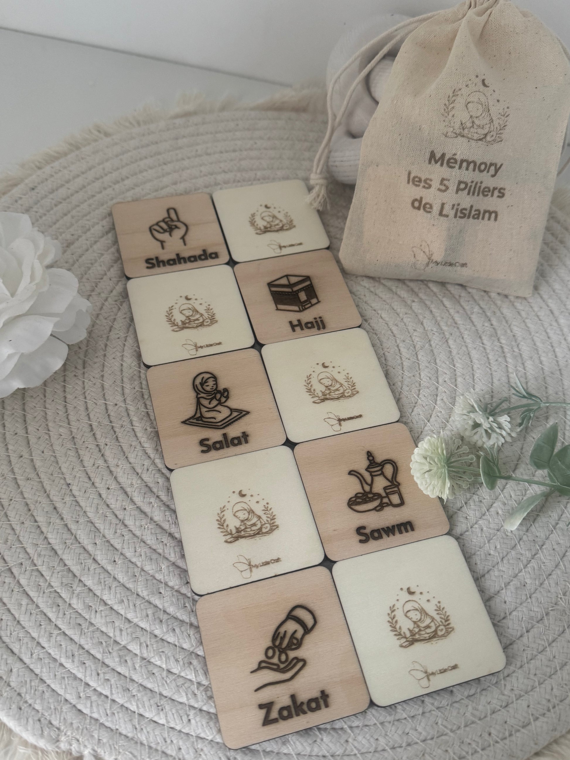 Ce jeu de memory éducatif a été conçu pour accompagner les enfants dans la découverte et la compréhension des cinq piliers de l’Islam, de manière ludique, douce et adaptée à leur âge.